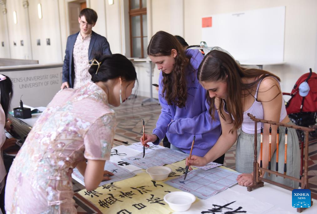 People practise Chinese calligraphy during a Chinese culture event celebrating the traditional Mid-Autumn Festival at the University of Graz, in Graz, Austria, Sept. 30, 2023. (Photo by Han Lu/Xinhua)