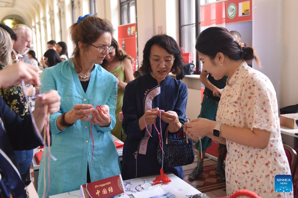 People learn to braid Chinese knots during a Chinese culture event celebrating the traditional Mid-Autumn Festival at the University of Graz, in Graz, Austria, Sept. 30, 2023. (Photo by Han Lu/Xinhua)