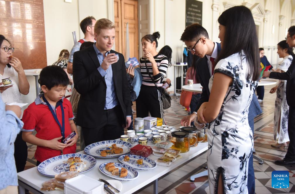 People taste tea and mooncakes during a Chinese culture event celebrating the traditional Mid-Autumn Festival at the University of Graz, in Graz, Austria, Sept. 30, 2023. (Photo by Han Lu/Xinhua)