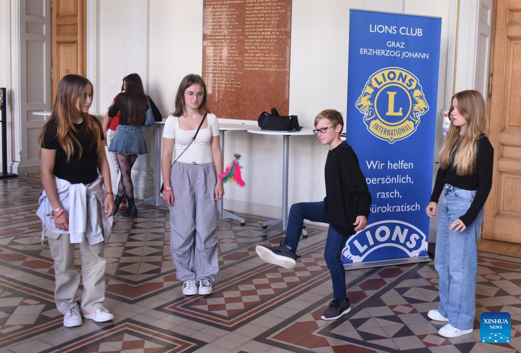 Young people play shuttlecock kicking game during a Chinese culture event celebrating the traditional Mid-Autumn Festival at the University of Graz, in Graz, Austria, Sept. 30, 2023. (Photo by Han Lu/Xinhua)
