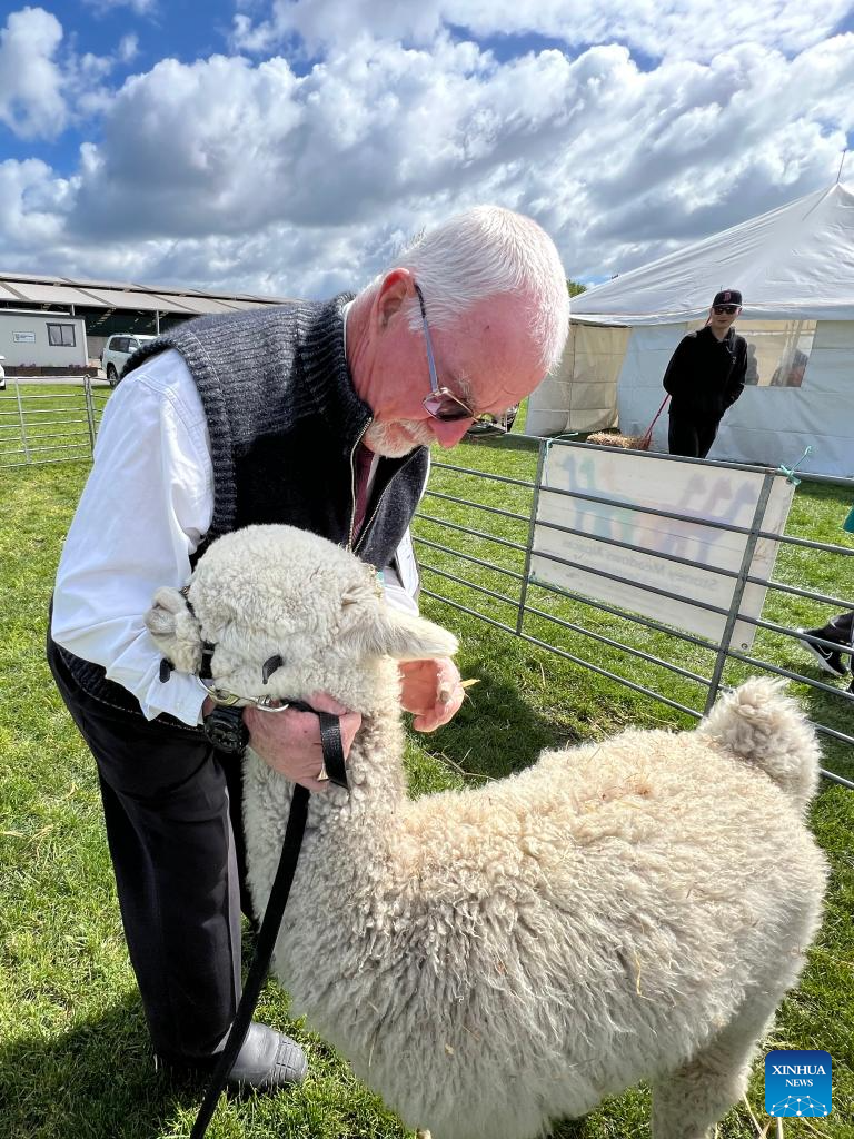 A man takes care of his alpaca at the New Zealand National Alpaca Show 2023 in Christchurch, New Zealand, Sept. 30, 2023. (Photo by Walter/Xinhua)