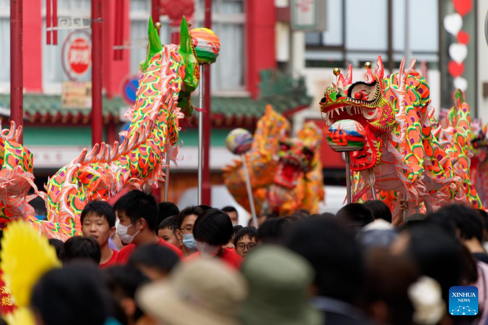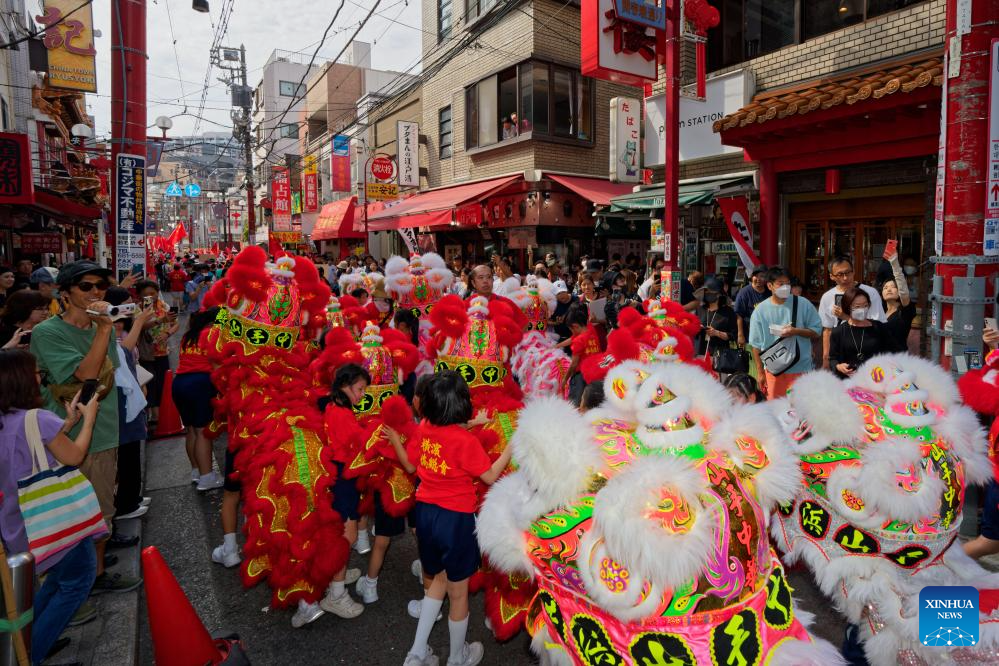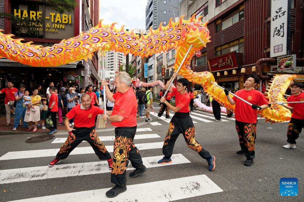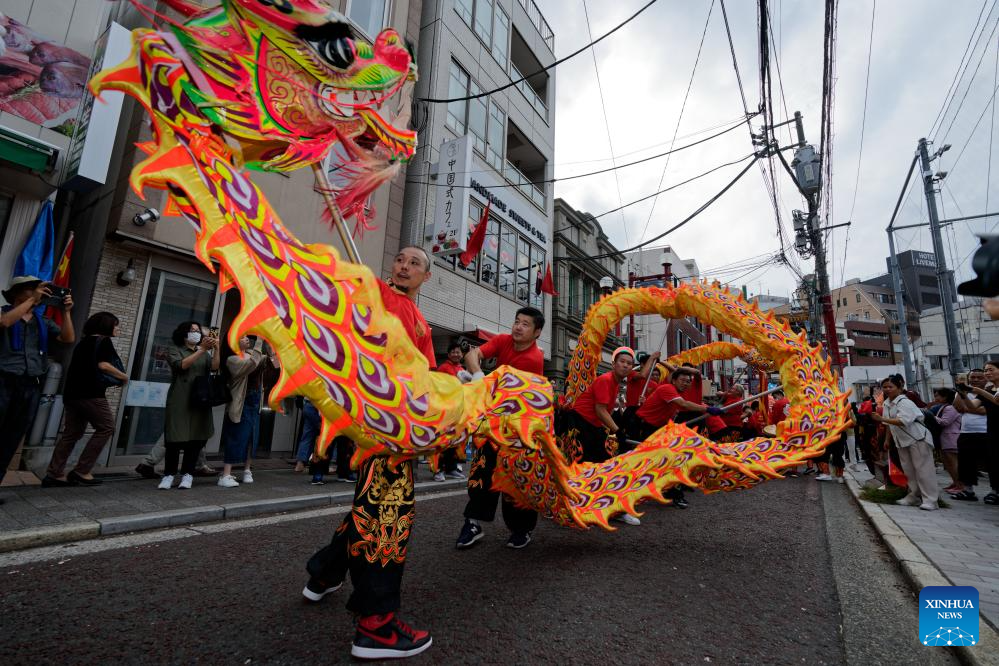 A dragon dance performance is staged at the Chinatown of Yokohama, Japan, Oct. 1, 2023. Chinese traditional performances were staged in the Chinatown of Yokohama on Sunday, attracting tourists coming here to experience Chinese culture. (Xinhua/Zhang Xiaoyu)