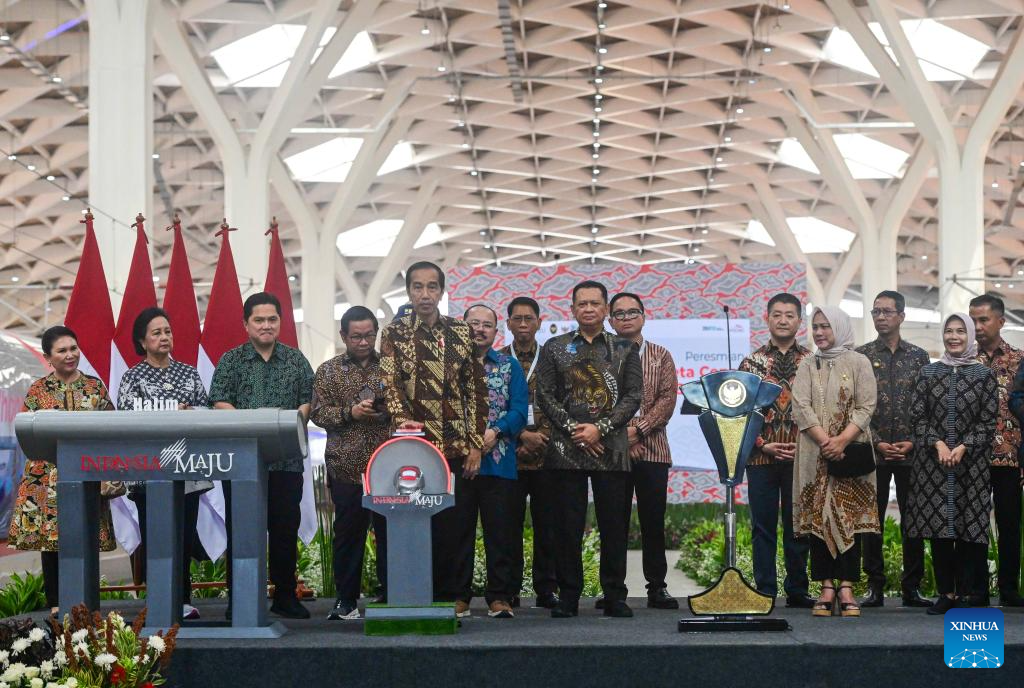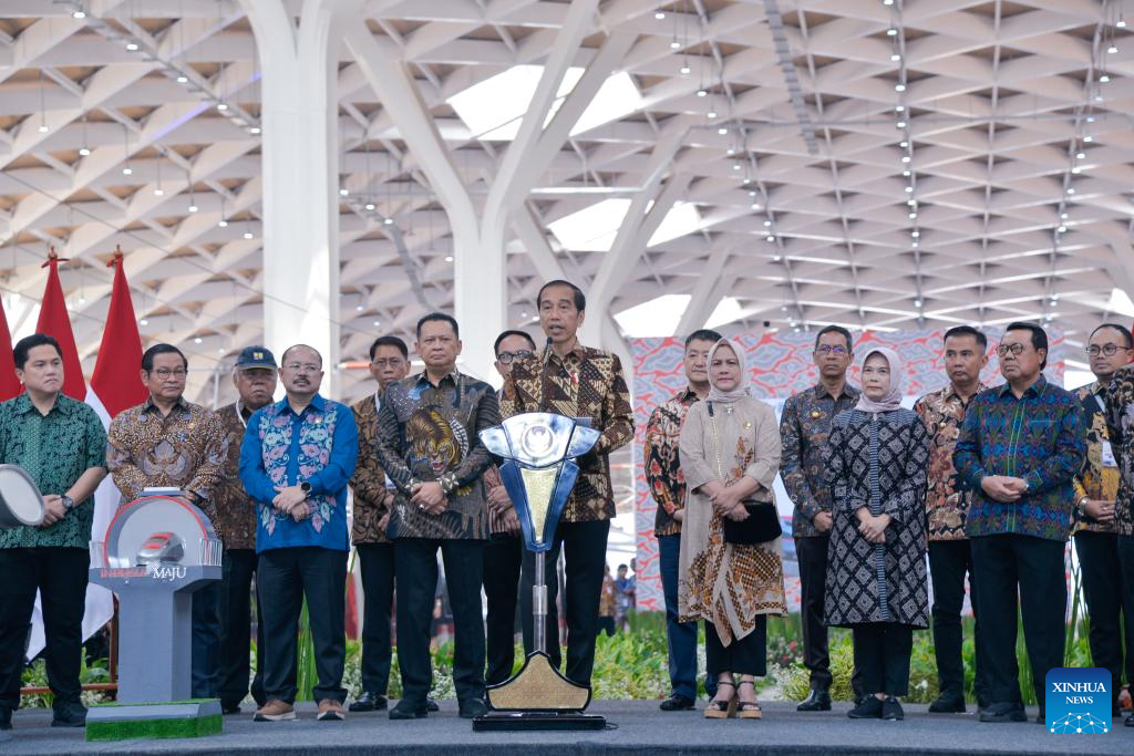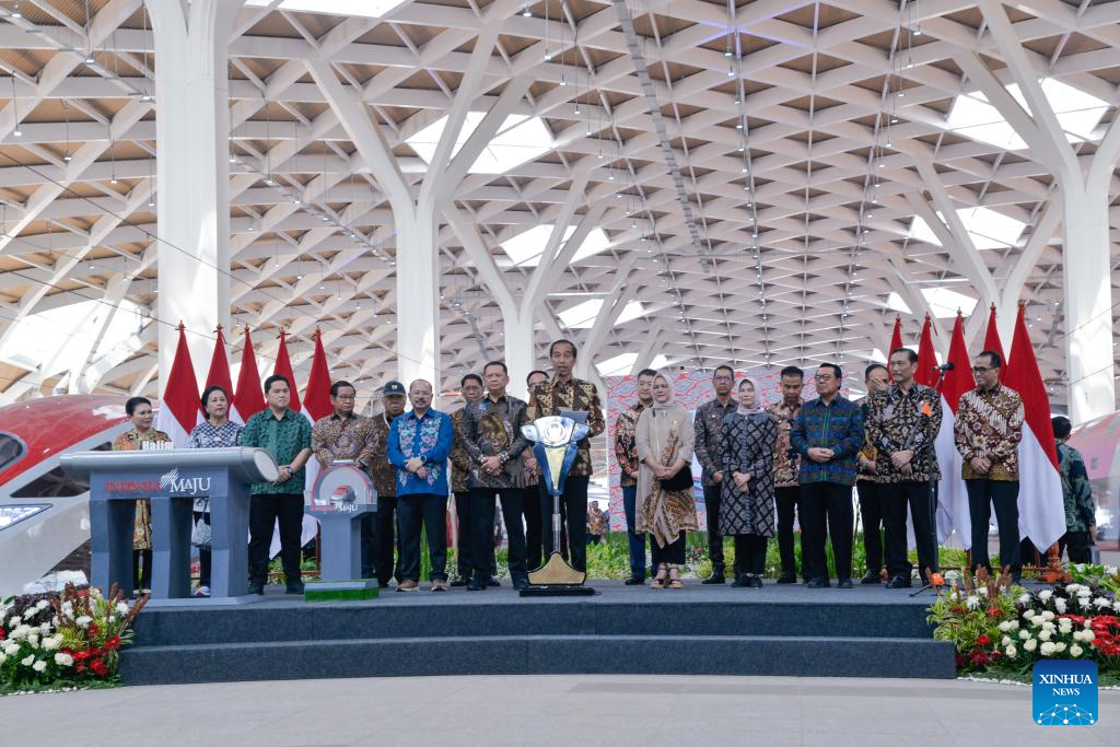 Indonesian President Joko Widodo (C) delivers a speech during a ceremony marking the official operation of the Jakarta-Bandung High-Speed Railway (HSR) at Halim Station in Jakarta, Indonesia, Oct. 2, 2023. Widodo declared the official operation of the Jakarta-Bandung High-Speed Railway (HSR) here on Monday morning. (Xinhua/Xu Qin)