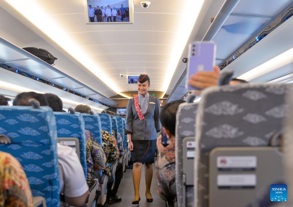 A train attendant walks in a high-speed electric multiple unit (EMU) train running on the Jakarta-Bandung High-Speed Railway in Indonesia, Oct. 2, 2023. Indonesian President Joko Widodo declared the official operation of the Jakarta-Bandung High-Speed Railway (HSR) at Halim Station in Jakarta Monday morning. (Xinhua/Xu Qin)