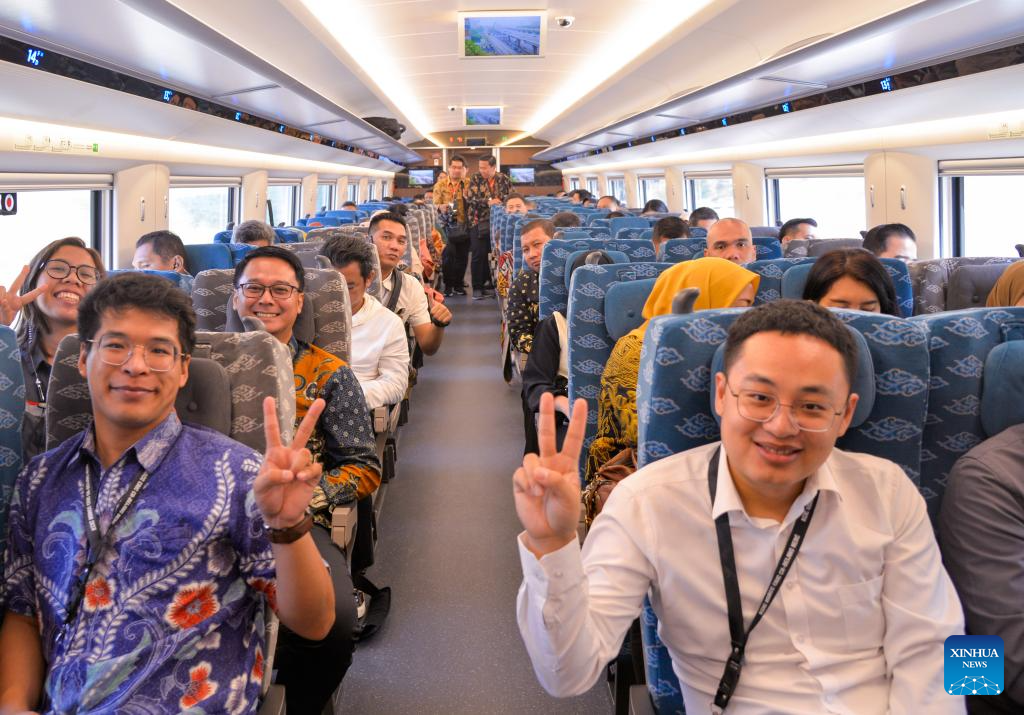 Passengers pose for photos aboard a high-speed electric multiple unit (EMU) train running on the Jakarta-Bandung High-Speed Railway in Indonesia, Oct. 2, 2023. Indonesian President Joko Widodo declared the official operation of the Jakarta-Bandung High-Speed Railway (HSR) at Halim Station in Jakarta Monday morning. (Xinhua/Xu Qin)