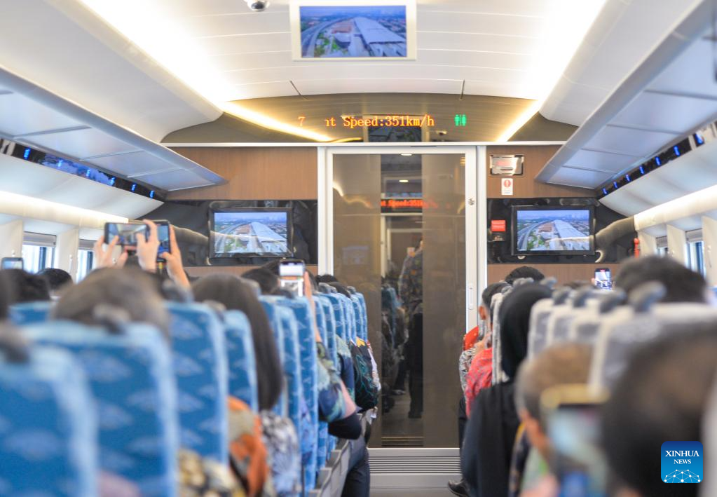 Passengers aboard a high-speed electric multiple unit (EMU) train running on the Jakarta-Bandung High-Speed Railway take photos and videos of a display panel showing the train's speed exceeding 350 kilometers per hour in Indonesia, Oct. 2, 2023. Indonesian President Joko Widodo declared the official operation of the Jakarta-Bandung High-Speed Railway (HSR) at Halim Station in Jakarta Monday morning. (Xinhua/Xu Qin)
