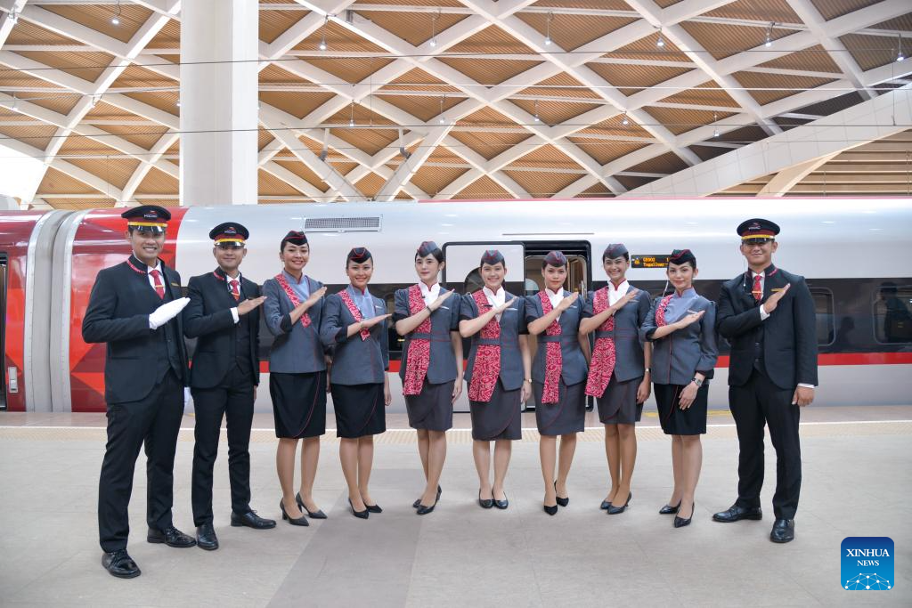 Crew members pose for photos with a high-speed electrical multiple unit (EMU) at Halim Station in Jakarta, Indonesia, Oct. 2, 2023. Indonesian President Joko Widodo declared the official operation of the Jakarta-Bandung High-Speed Railway (HSR) here on Monday morning. (Xinhua/Xu Qin)