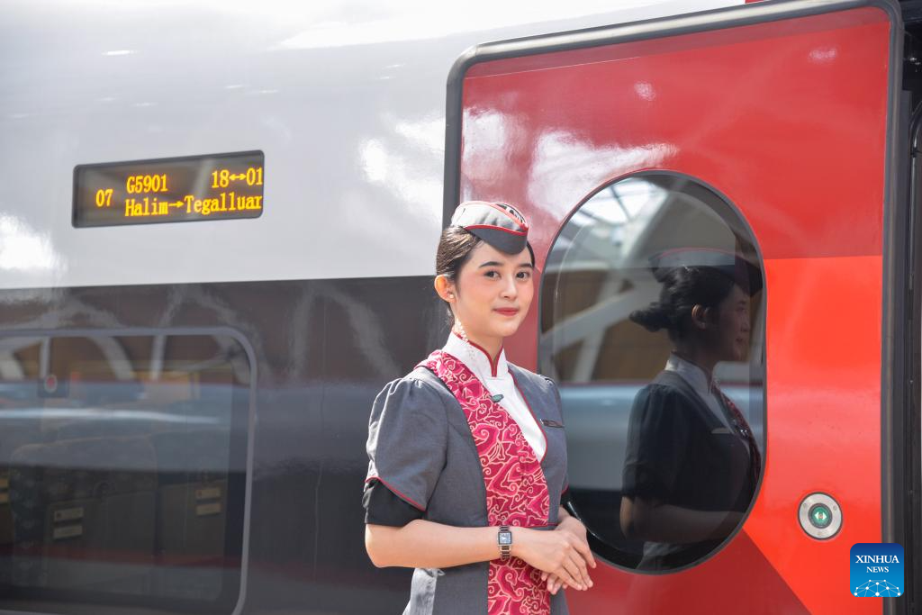 A crew member of a high-speed electric multiple unit (EMU) train for the Jakarta-Bandung High-Speed Railway greets passengers and guests at Halim Station in Jakarta, Indonesia, Oct. 2, 2023. Indonesian President Joko Widodo declared the official operation of the Jakarta-Bandung High-Speed Railway (HSR) here on Monday morning. (Xinhua/Xu Qin)