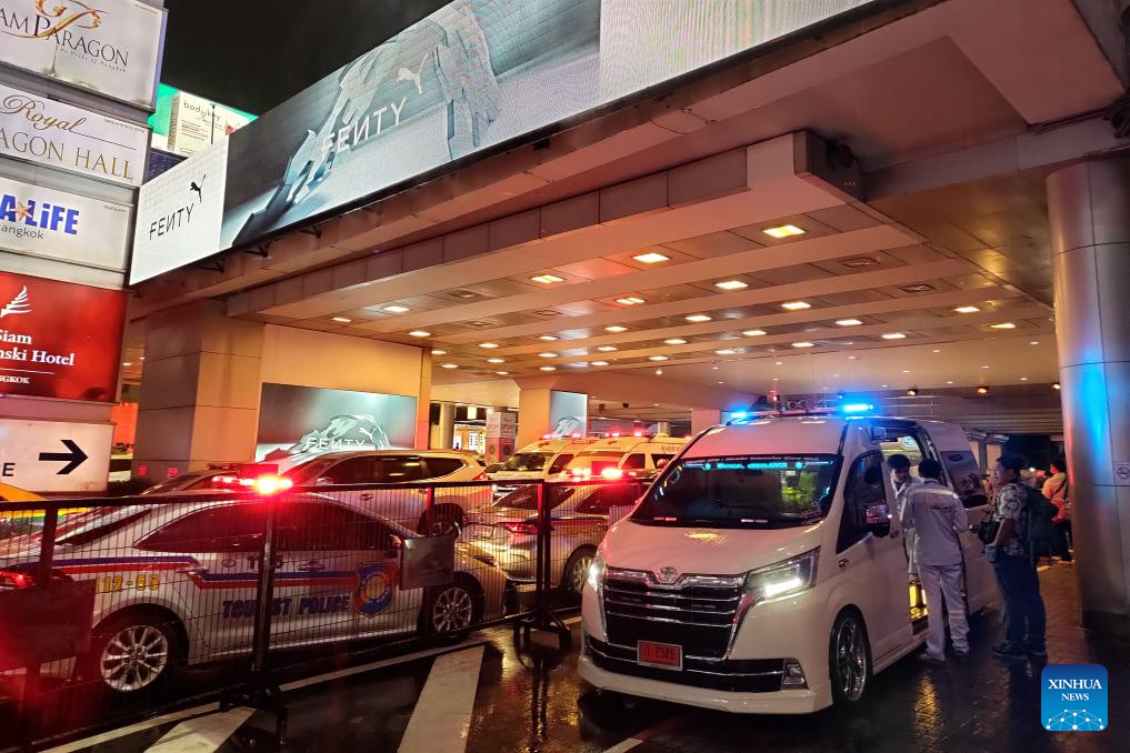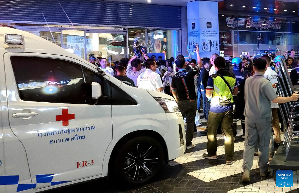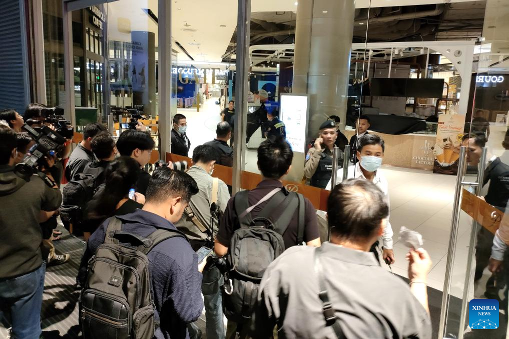 This photo taken on Oct. 3, 2023 with a mobile phone shows emergency staff members on duty at the shopping mall where a shooting took place in Bangkok, Thailand. A suspected gunman was arrested following gunshots heard in a renowned shopping mall in downtown Bangkok on Tuesday, police said. The Central Investigation Bureau of the Thai police said a perpetrator with a gun was arrested, and they were monitoring the situation of potential casualties. The official Thai News Agency, quoting local police, said the initial report put the casualties at three dead and two injured. (Xinhua/Wang Teng)