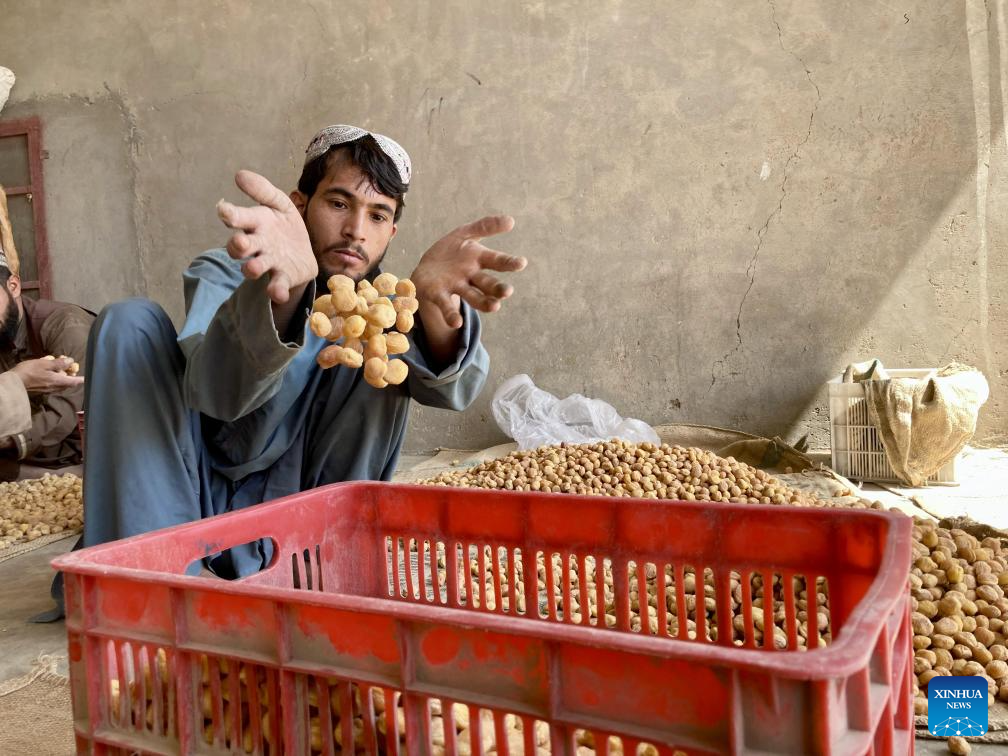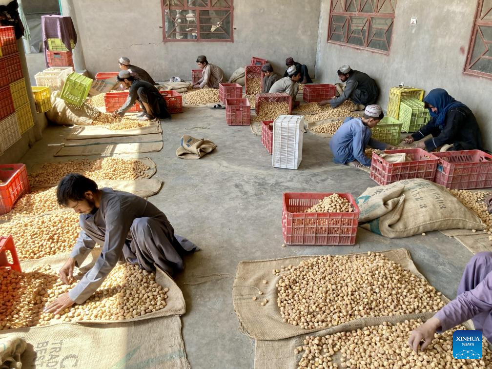 Workers sort dried apricots at a factory in Kandahar Province, Afghanistan, Oct. 3, 2023. (Photo by Arghand/Xinhua)