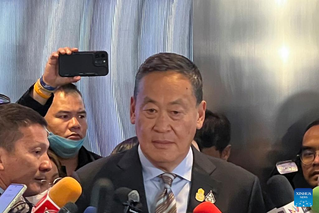 This photo taken on Oct. 4, 2023 with a mobile phone shows Thailand's Prime Minister Srettha Thavisin speaking to the media at the Siam Paragon Mall in Bangkok, Thailand.