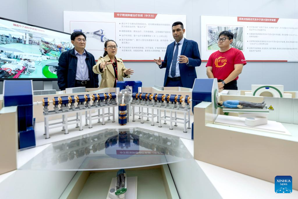 Muhammed Shahbaz (2nd R) learns about cutting-edge medical technologies at the International Academy of Neutron Science in Qingdao, east China's Shandong Province, Oct. 14, 2023.