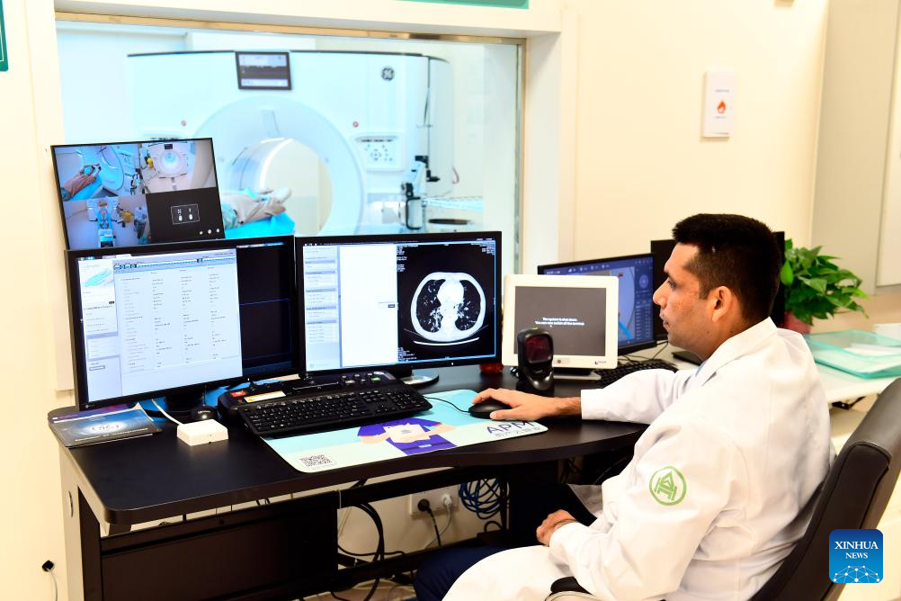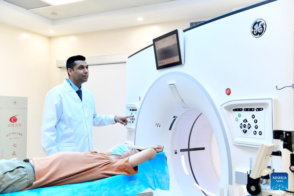 Muhammed Shahbaz conducts a CT scanning for a patient at the Qilu Hospital of Shandong University in Jinan, east China's Shandong Province, Oct. 16, 2023.