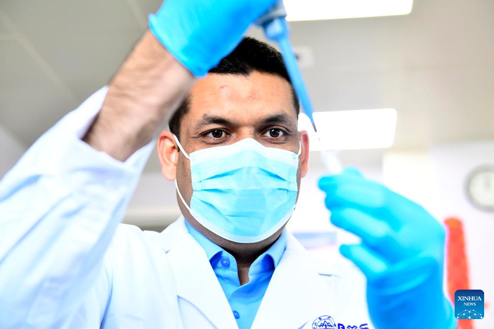 Muhammed Shahbaz conducts experiments at a laboratory of the Qilu Hospital of Shandong University in Jinan, east China's Shandong Province, Oct. 16, 2023.