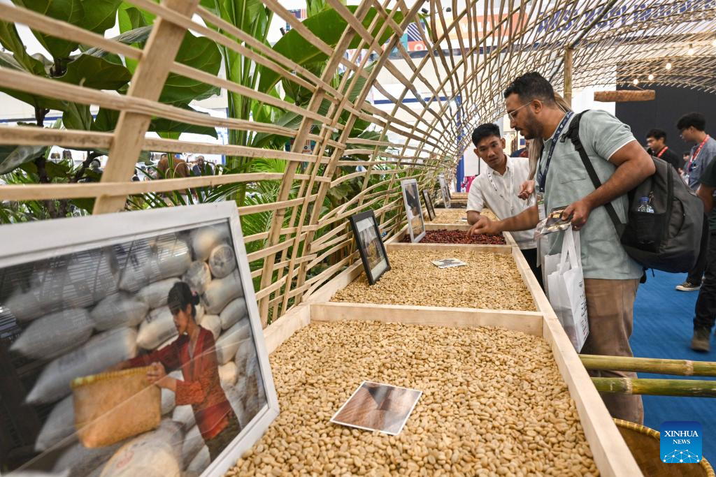 A visitor selects products on display during Indonesia Trade Expo 2023 in Tangerang of Banten province, Indonesia, on Oct. 18, 2023. The five-day expo presents exhibits from various industrial sectors including mining, agriculture and crafts. (Xinhua/Agung Kuncahya B.)