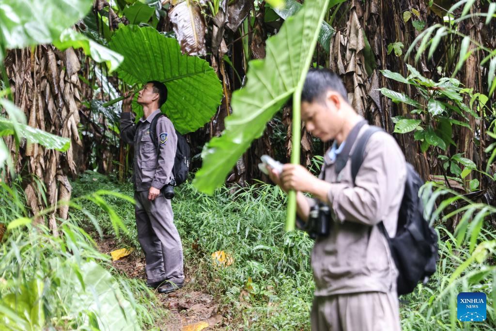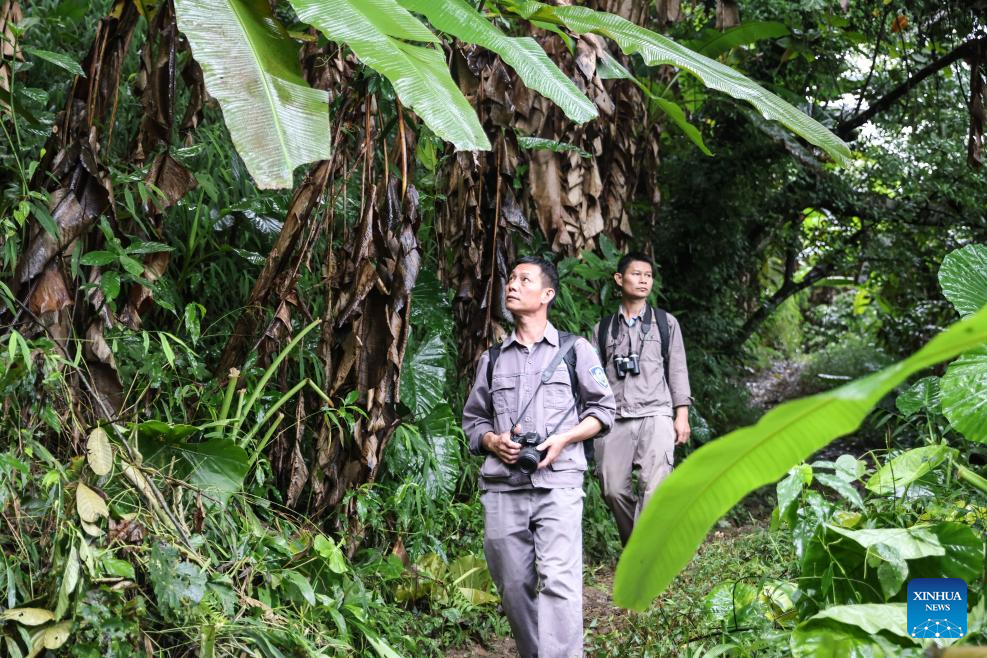 Li Wenyong (L) and his colleague patrol the Bawangling area of Hainan Tropical Rainforest National Park, south China's Hainan Province, Oct. 18, 2023. (Xinhua/Fan Yuqing)