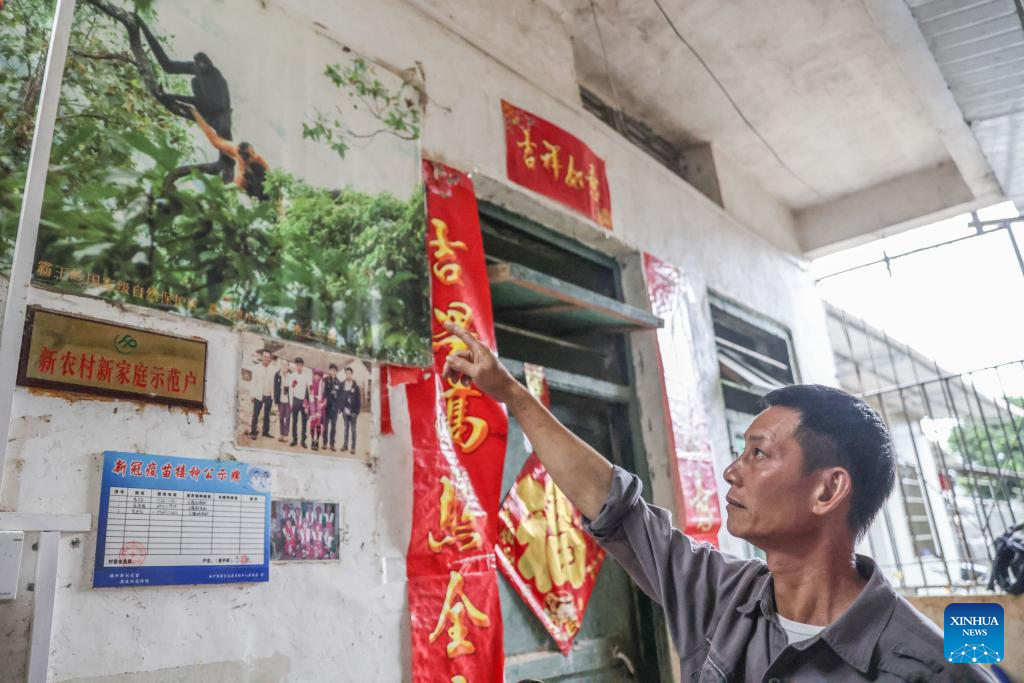 Li Wenyong views photos at home in Baisha Li Autonomous County, south China's Hainan Province, Oct. 18, 2023. (Xinhua/Zhang Liyun)