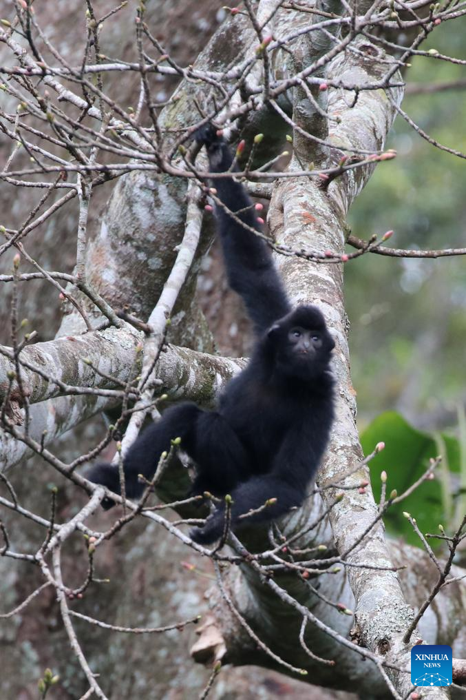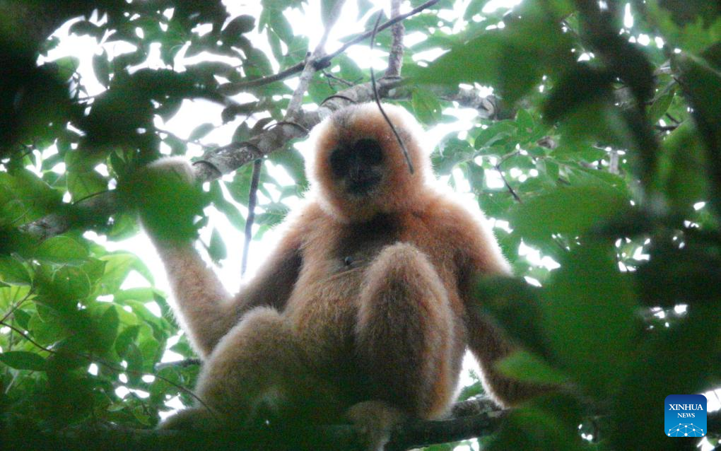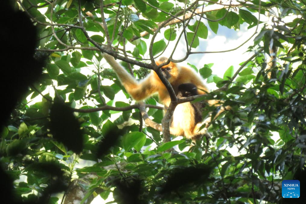 This photo taken in 2022 shows a Hainan gibbon in the Bawangling area of Hainan Tropical Rainforest National Park, south China's Hainan Province. (Hainan Tropical Rainforest National Park/Handout via Xinhua)