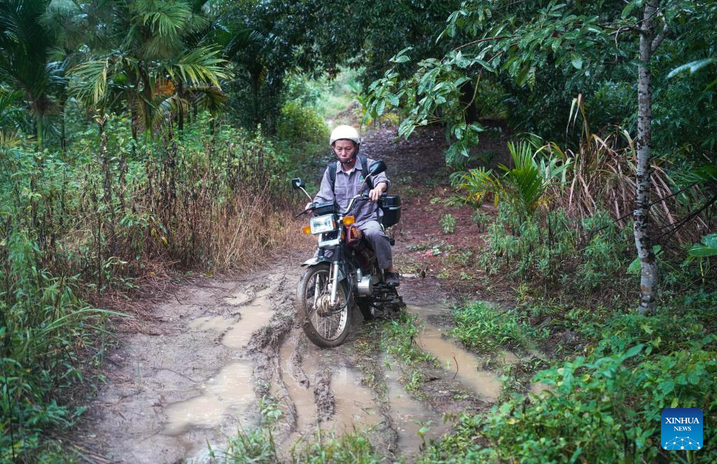 Li Wenyong works in the Bawangling area of Hainan Tropical Rainforest National Park, south China's Hainan Province, Oct. 18, 2023. (Xinhua/Fan Yuqing)