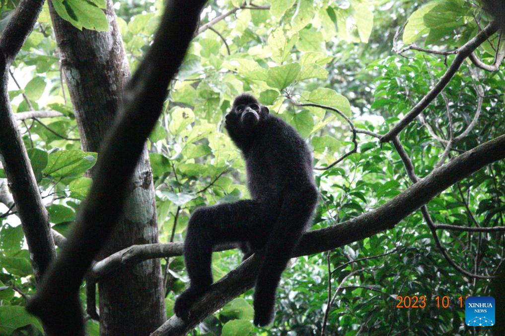 This photo taken on Oct. 14, 2023 shows a Hainan gibbon in the Bawangling area of Hainan Tropical Rainforest National Park, south China's Hainan Province. (Photo by Li Wenyong/Xinhua)