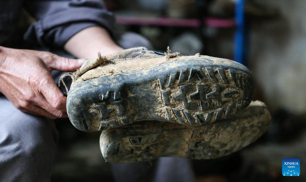 Li Wenyong shows a pair of worn-out shoes in Baisha Li Autonomous County, south China's Hainan Province, Oct. 18, 2023. (Xinhua/Fan Yuqing)