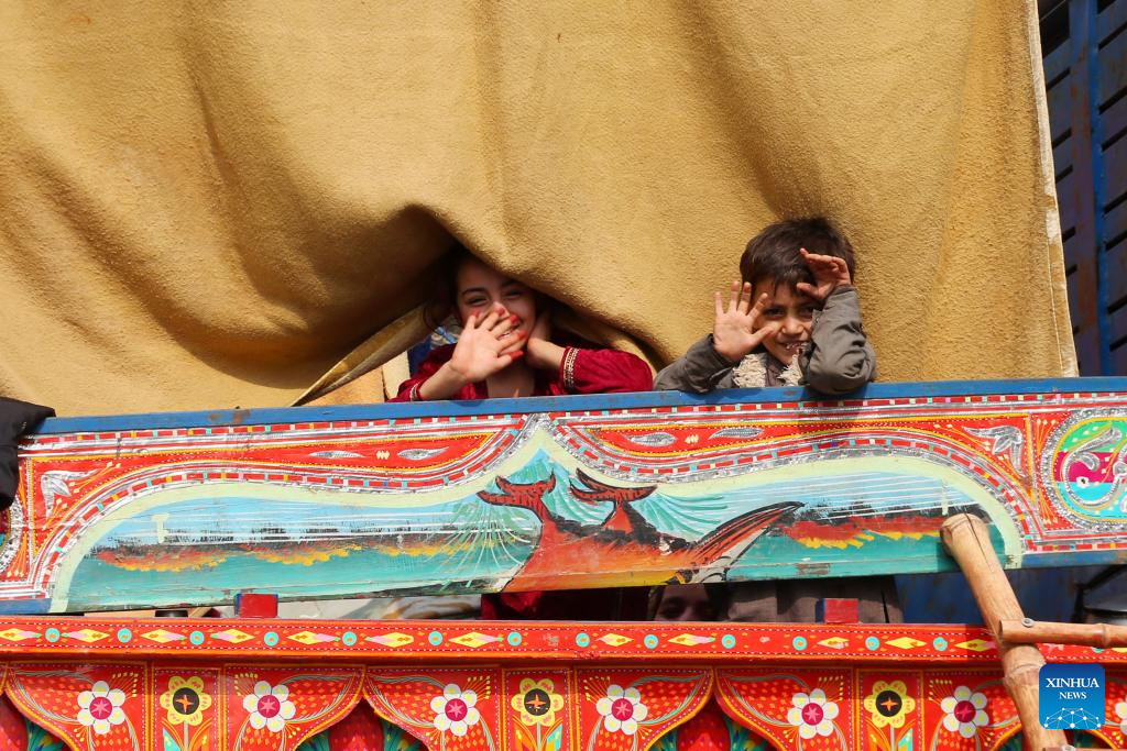 Afghan refugees wait on a truck before returning to their home country, on the outskirts of northwest Pakistan's Peshawar, Oct. 30, 2023. (Photo by Umar Qayyum/Xinhua)