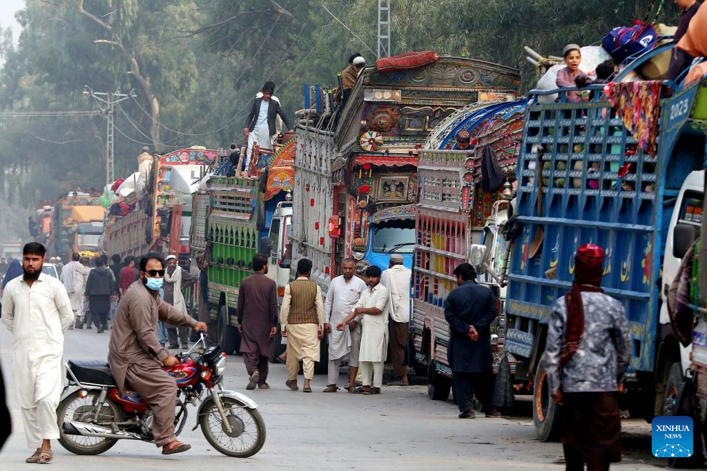 Trucks loaded with belongings of Afghan refugees wait to return to Afghanistan, on the outskirts of northwest Pakistan's Peshawar, Oct. 30, 2023. (Photo by Umar Qayyum/Xinhua)