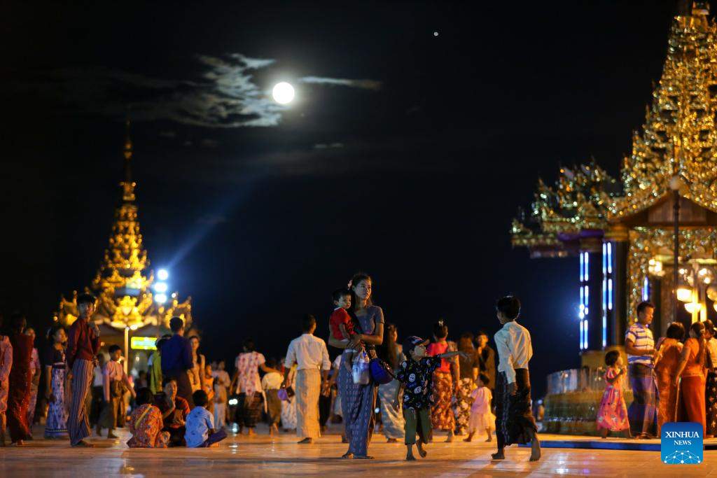 People visit the Uppatasanti Pagoda during the Thadingyut Festival in Nay Pyi Taw, Myanmar, Oct. 29, 2023. Myanmar's traditional Thadingyut festival starts on Oct. 28 this year. The Thadingyut Festival, known as the the lighting festival, is traditionally celebrated for three days. (Photo by Myo Kyaw Soe/Xinhua)