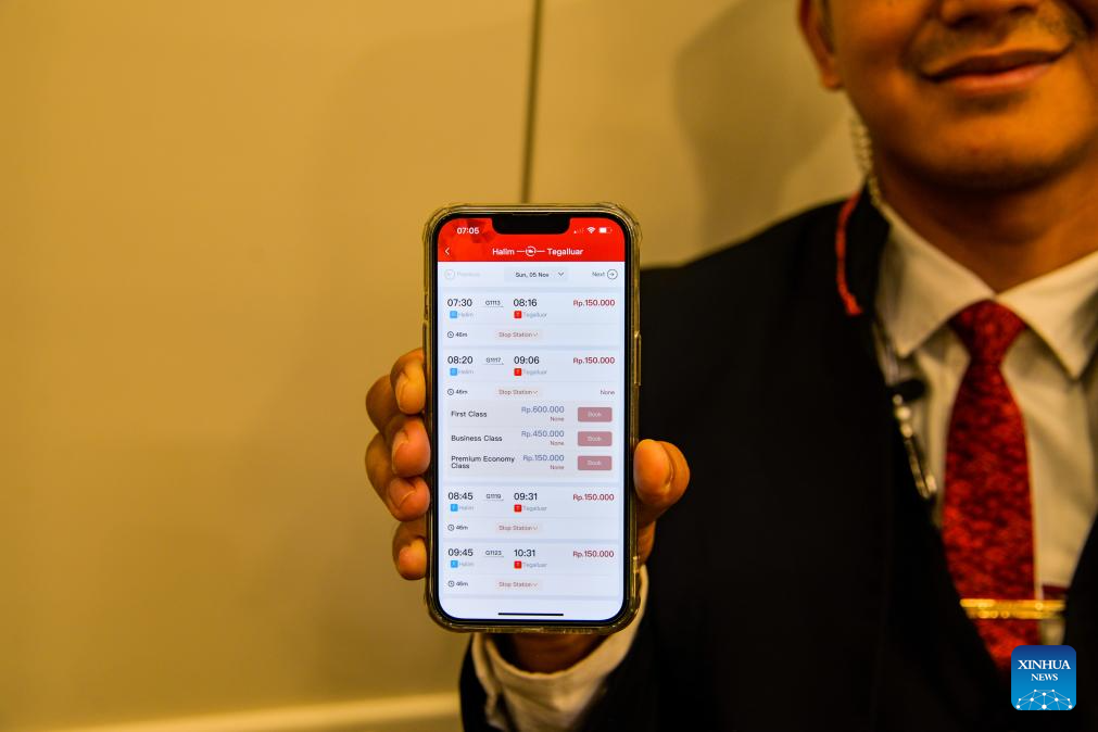 A crew member aboard a high-speed train of the Jakarta-Bandung High-Speed Railway demonstrates a mobile app, which shows some tickets of the day have been sold out, in Indonesia, Nov. 5, 2023. The Jakarta-Bandung High-Speed Railway (HSR), connecting Jakarta and the fourth largest city Bandung, is a flagship project that synergizes the China-proposed Belt and Road Initiative and Indonesia's Global Maritime Fulcrum strategy.