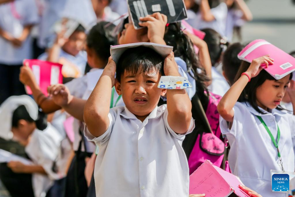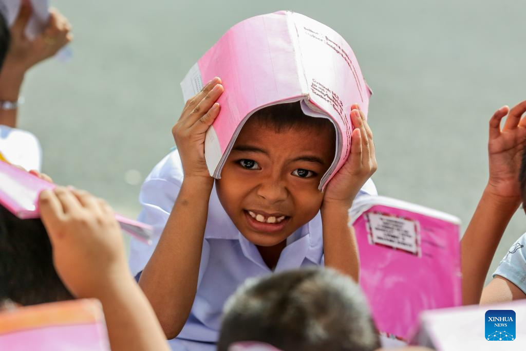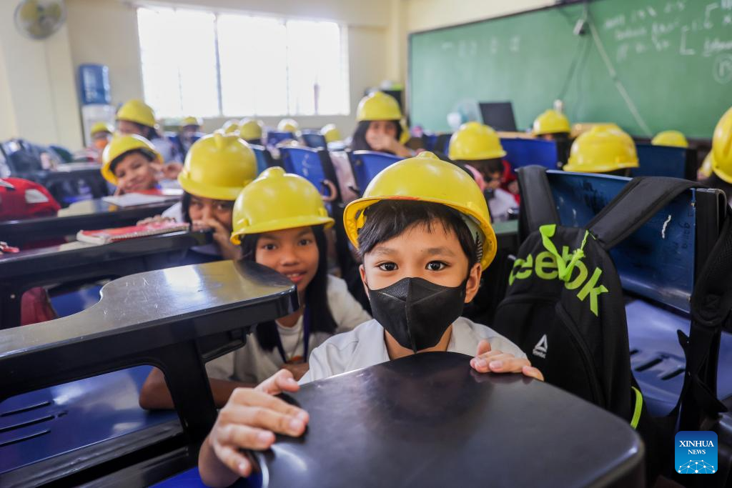 Students wearing hard hats participate in a nationwide simultaneous earthquake drill at a school in Quezon City, the Philippines, Nov. 9, 2023. (Xinhua/Rouelle Umali)