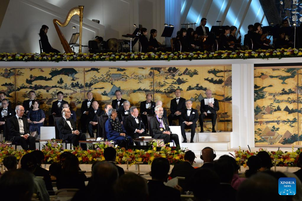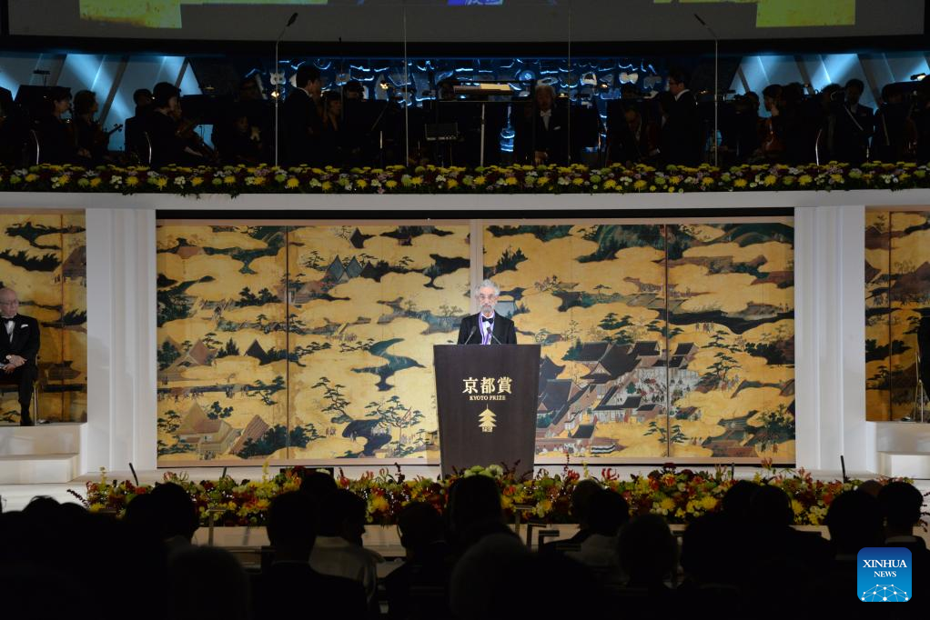 The awarding ceremony of the 38th annual Kyoto Prize is held in Kyoto, Japan, Nov. 10, 2023. Three scholars were awarded the 38th annual Kyoto Prize at a ceremony in Japan's Kyoto on Friday in recognition of their great achievements in the fields of advanced technology, basic sciences and arts and philosophy, respectively. (Xinhua/Tu Yifan)
