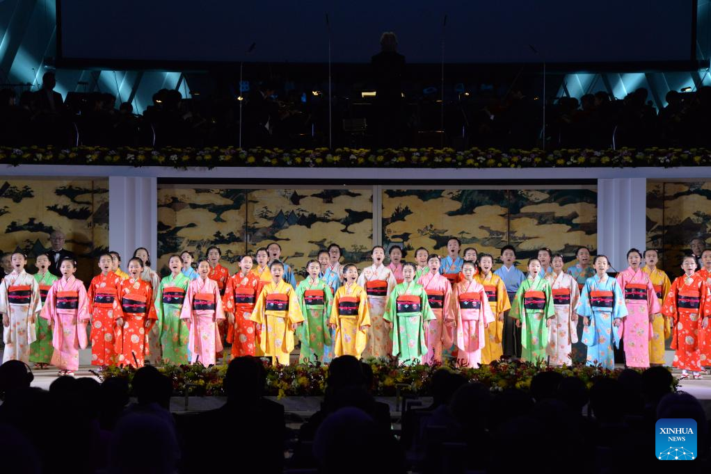 A choral performance is staged during the awarding ceremony of the 38th annual Kyoto Prize in Kyoto, Japan, Nov. 10, 2023. Three scholars were awarded the 38th annual Kyoto Prize at a ceremony in Japan's Kyoto on Friday in recognition of their great achievements in the fields of advanced technology, basic sciences and arts and philosophy, respectively. (Xinhua/Tu Yifan)