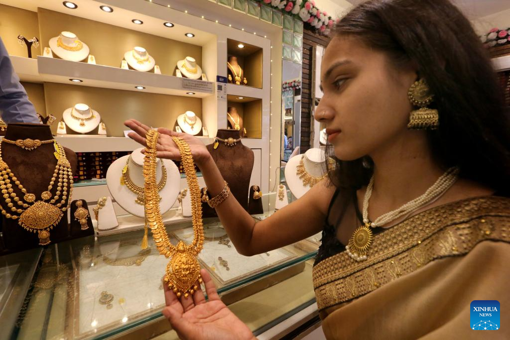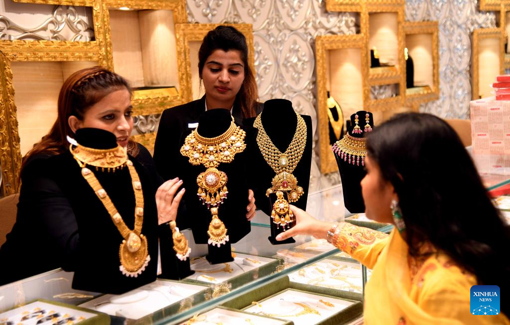 A woman buys gold jewelry from a jewelry shop on the occasion of Dhanteras festival in Bhopal, India, Nov. 10, 2023. Hindu devotees purchase jewelry and utensils on the occasion of Dhanteras, which is celebrated ahead of Diwali, the Hindu festival of lights. (Str/Xinhua)