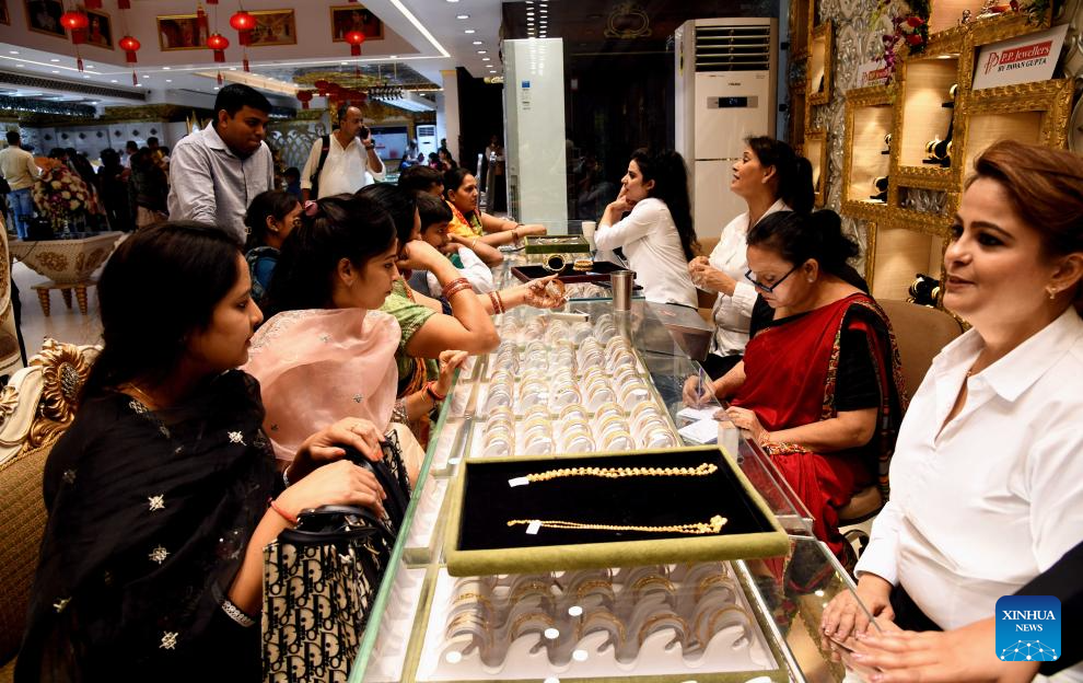 People buy gold jewelry from a jewelry shop on the occasion of Dhanteras festival in Bhopal, India, Nov. 10, 2023. Hindu devotees purchase jewelry and utensils on the occasion of Dhanteras, which is celebrated ahead of Diwali, the Hindu festival of lights. (Str/Xinhua)