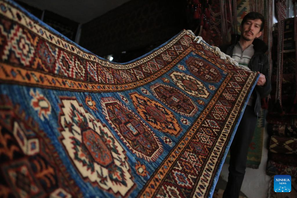 A man displays a carpet in Kabul, Afghanistan, Nov. 8, 2023. (Photo by Saifurahman Safi/Xinhua)