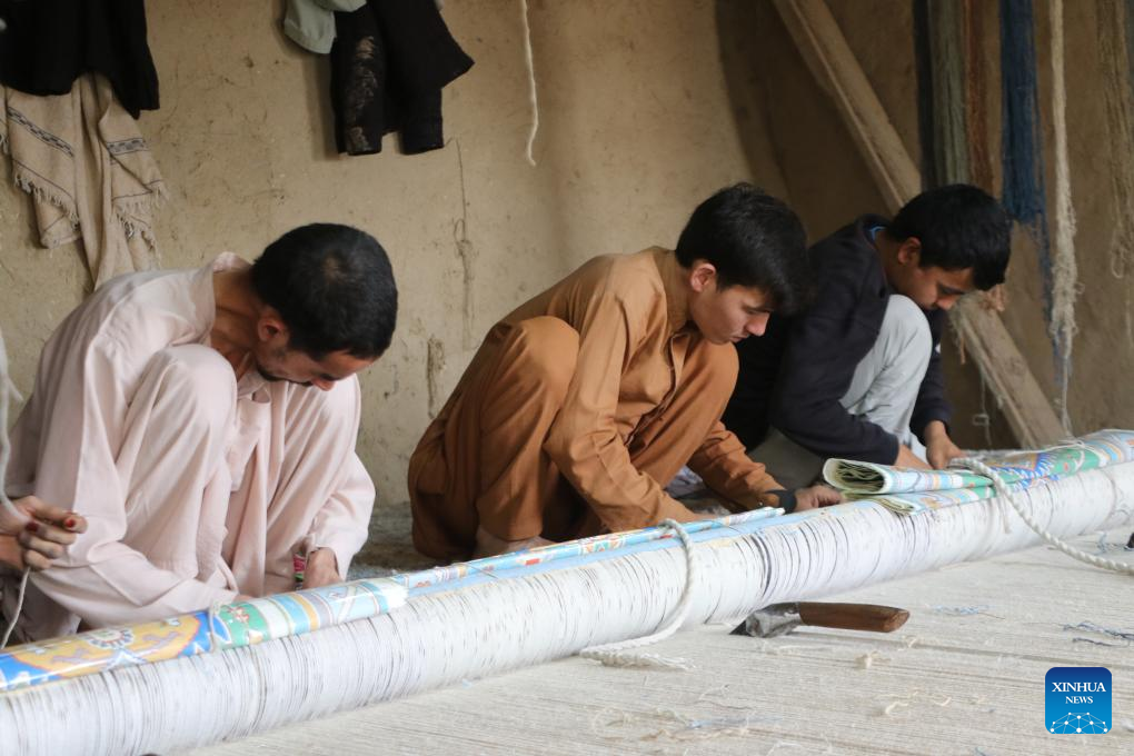 Workers make a carpet in Jawzjan Province, Afghanistan, Nov. 8, 2023. (Photo by Ahmad Zubair/Xinhua)