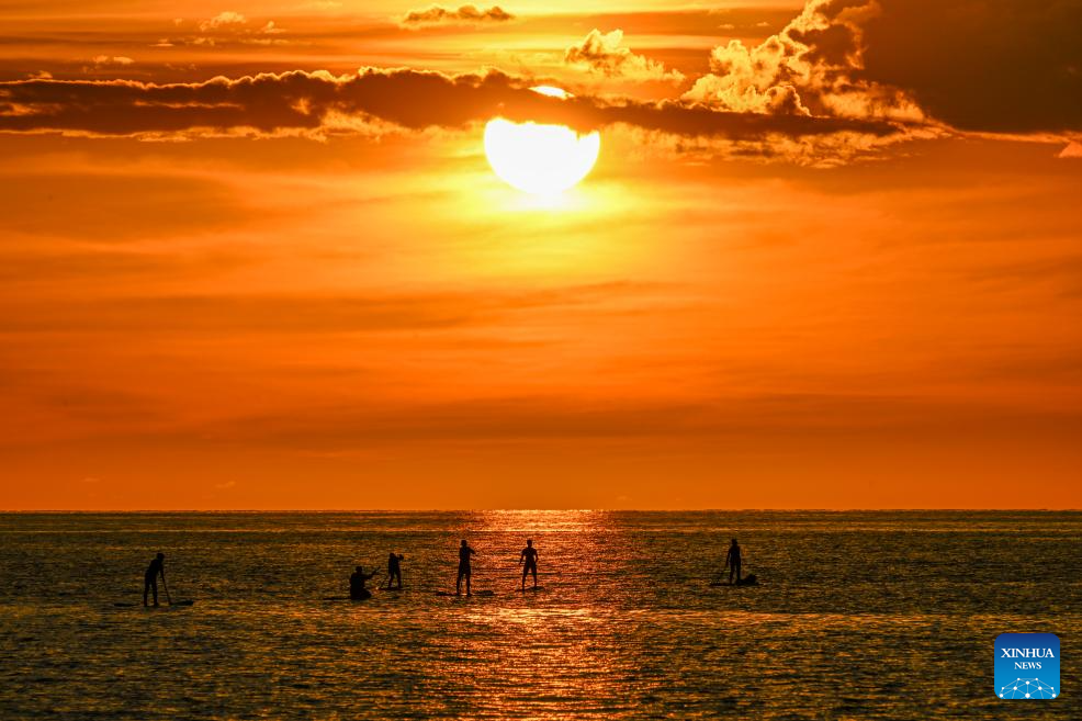 People enjoy themselves on the sea at sunset in Kota Kinabalu, Sabah, Malaysia, Nov. 14, 2023. (Xinhua/Cheng Yiheng)