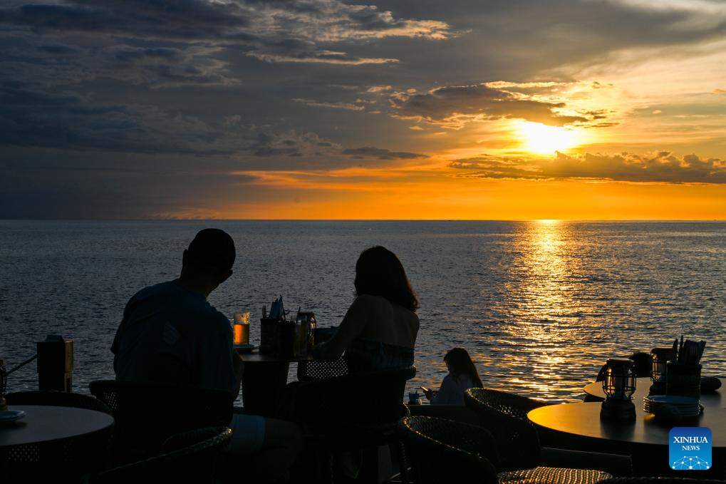 People enjoy the sunset at a cafe near seaside in Kota Kinabalu, Sabah, Malaysia, Nov. 14, 2023. (Xinhua/Cheng Yiheng)