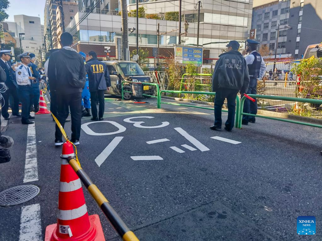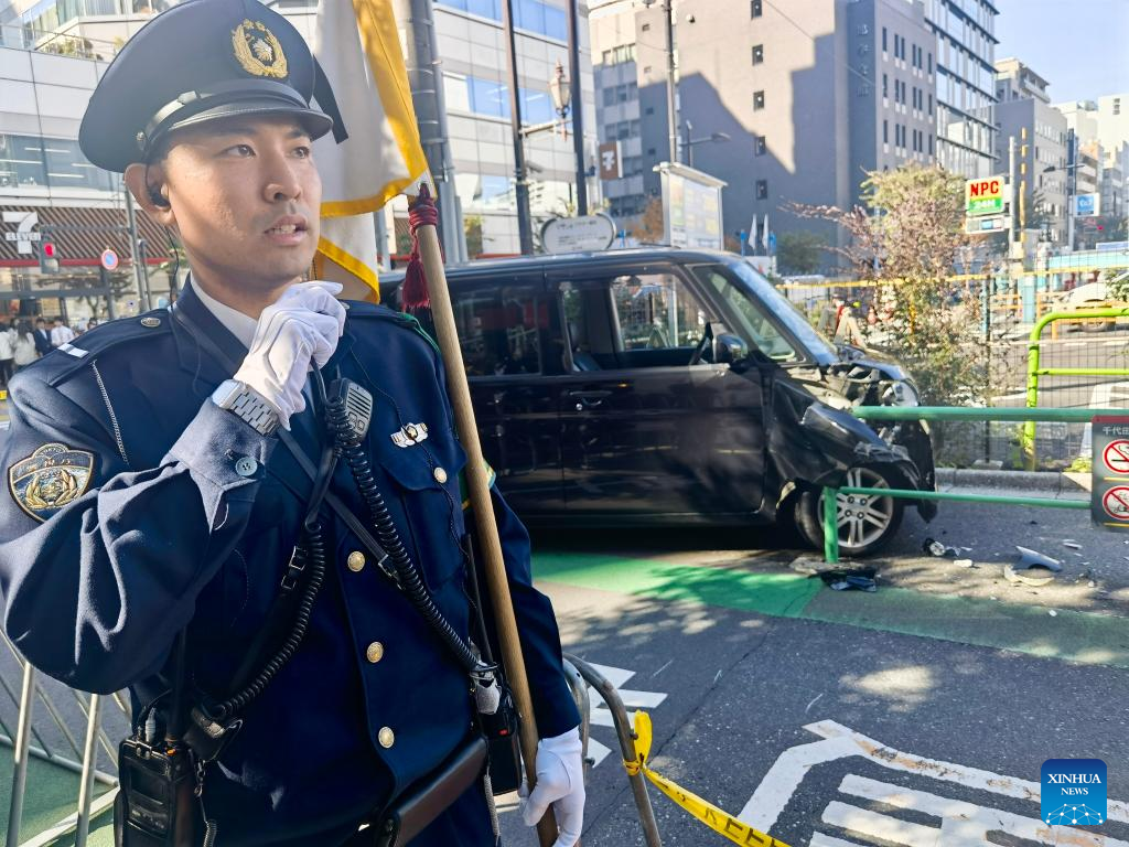 This photo taken with a mobile phone on Nov. 16, 2023 shows the scene of a car crash near the Israeli Embassy in Tokyo, Japan. A car crashed into a barricade near the Israeli Embassy in Tokyo on Thursday, injuring one police officer, local media reported. (Xinhua/Zhong Ya)