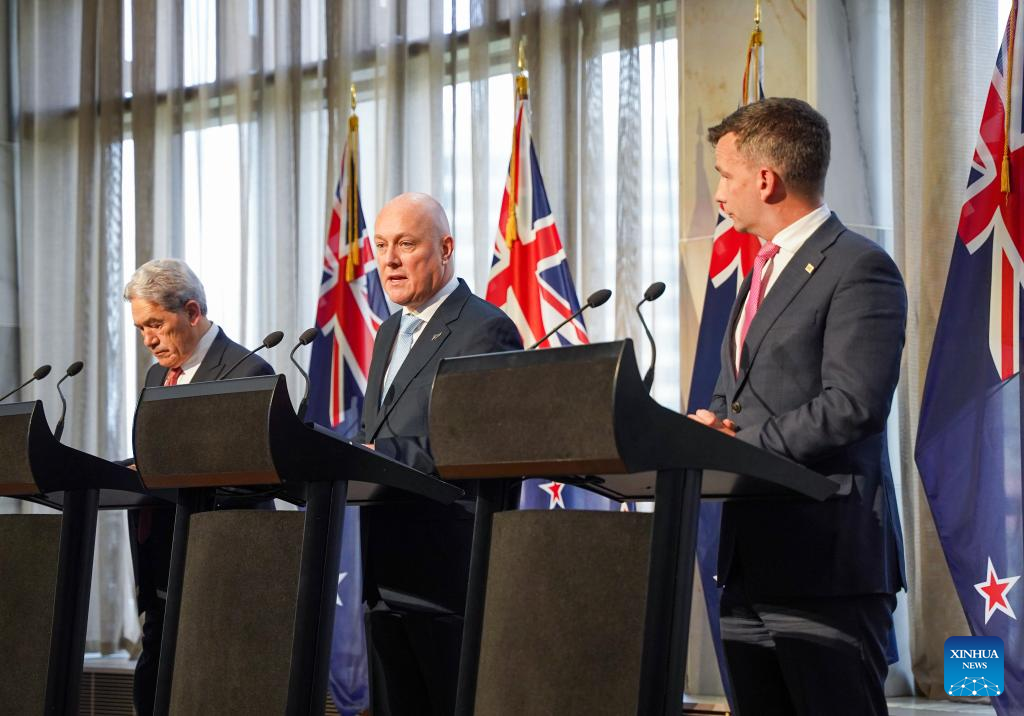 National Party's leader and incoming Prime Minister Christopher Luxon (C) speaks at the parliament in Wellington, New Zealand, Nov. 24, 2023. Three New Zealand political parties announced on Friday the lineup for a new coalition government after weeks of negotiations. The new coalition government of National Party, ACT New Zealand party and New Zealand First party will be stable, effective and will deliver for all New Zealanders, National's leader and incoming Prime Minister Christopher Luxon said during the signing ceremony at the parliament. (Prime Minister Office of New Zealand/Handout via Xinhua)