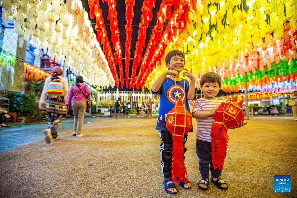 Children holding lanterns are seen at the Wat Phra That Hariphunchai in Lamphun, Thailand, Nov. 23, 2023. Lamphun Province of Thailand held a grand lantern festival at the Wat Phra That Hariphunchai, attracting tourists to hang lanterns and make wishes. (Xinhua/Wang Teng)
