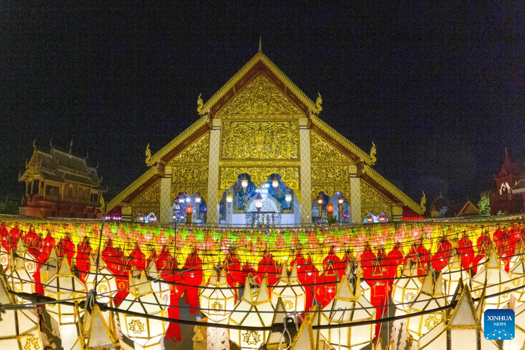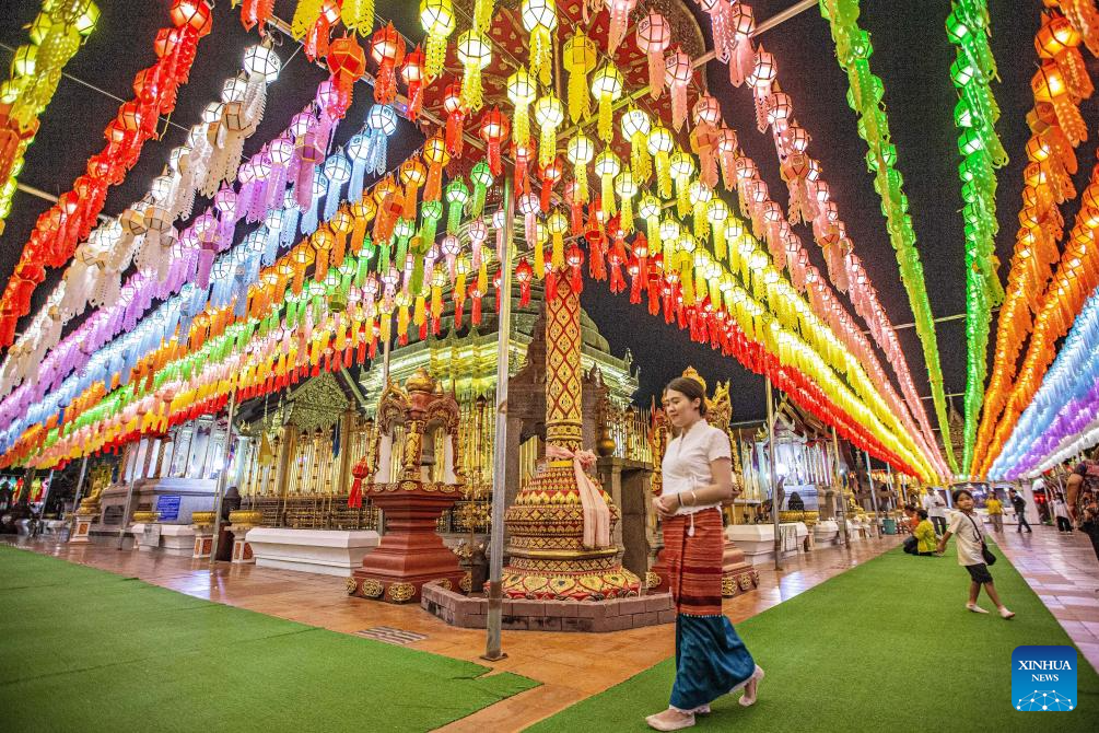 This photo taken on Nov. 23, 2023 shows colorful lanterns at the Wat Phra That Hariphunchai in Lamphun, Thailand. Lamphun Province of Thailand held a grand lantern festival at the Wat Phra That Hariphunchai, attracting tourists to hang lanterns and make wishes. (Xinhua/Wang Teng)