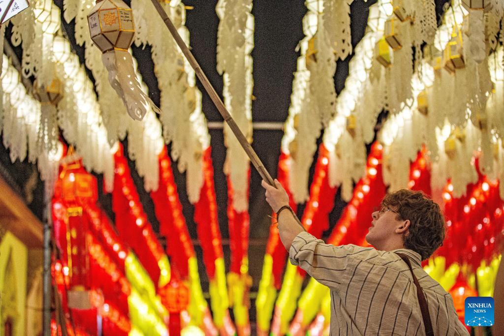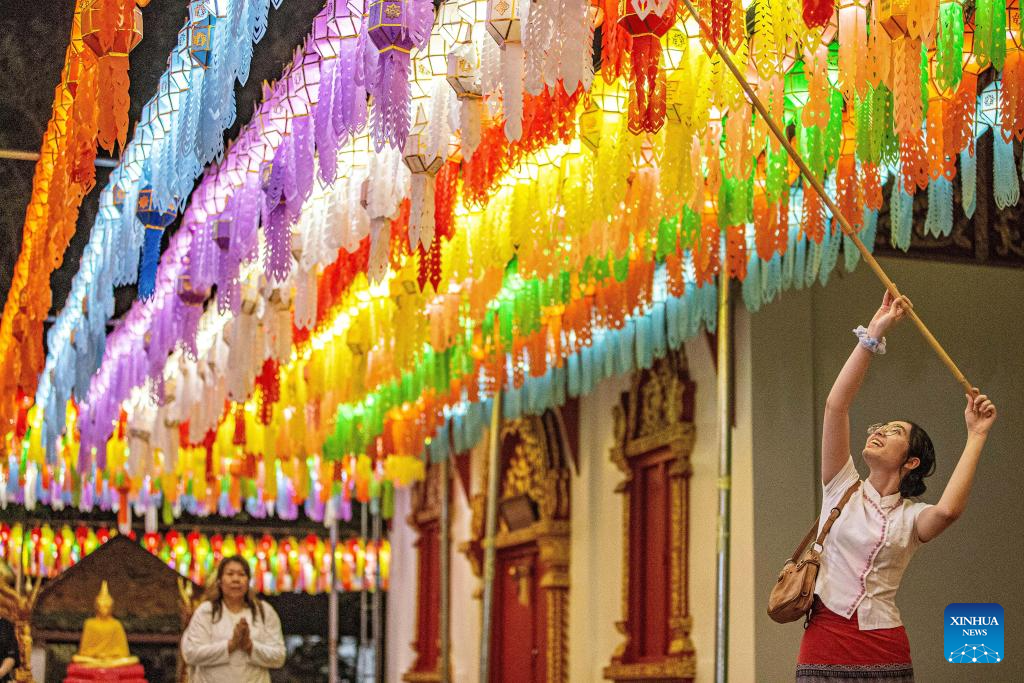 A tourist hangs a lantern at the Wat Phra That Hariphunchai in Lamphun, Thailand, Nov. 23, 2023. Lamphun Province of Thailand held a grand lantern festival at the Wat Phra That Hariphunchai, attracting tourists to hang lanterns and make wishes. (Xinhua/Wang Teng)