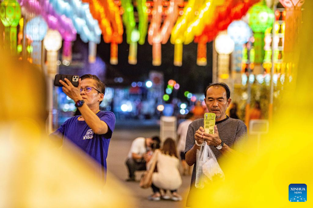 Tourists take photos of lanterns at the Wat Phra That Hariphunchai in Lamphun, Thailand, Nov. 23, 2023. Lamphun Province of Thailand held a grand lantern festival at the Wat Phra That Hariphunchai, attracting tourists to hang lanterns and make wishes. (Xinhua/Wang Teng)