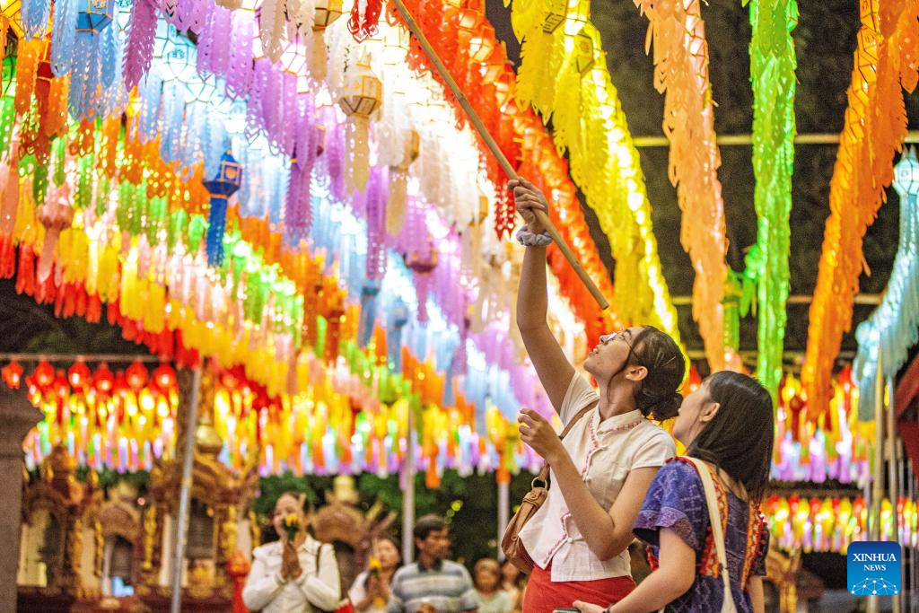 Tourists hang a lantern at the Wat Phra That Hariphunchai in Lamphun, Thailand, Nov. 23, 2023. Lamphun Province of Thailand held a grand lantern festival at the Wat Phra That Hariphunchai, attracting tourists to hang lanterns and make wishes. (Xinhua/Wang Teng)