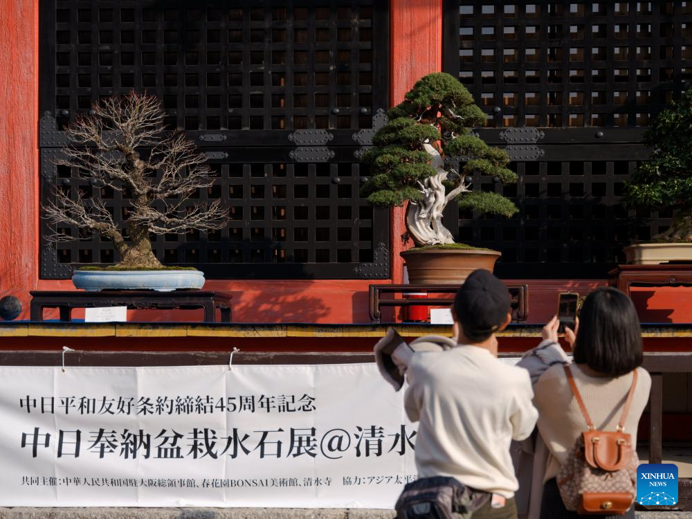 People visit a bonsai and suiseki exhibition at Kiyomizu-dera Temple in Kyoto, Japan, Nov. 24, 2023. A four-day bonsai and suiseki exhibition commemorating the 45th anniversary of the signing of the China-Japan Treaty of Peace and Friendship kicked off here on Friday. (Xinhua/Zhang Xiaoyu)