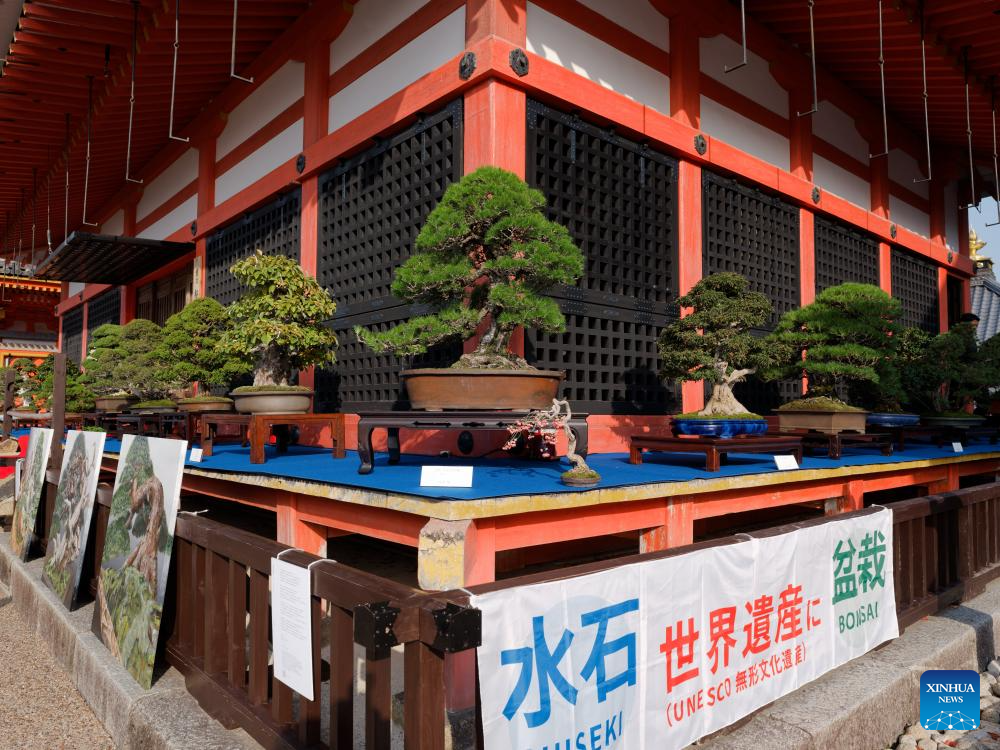 This photo shows bonsais during a bonsai and suiseki exhibition at Kiyomizu-dera Temple in Kyoto, Japan, Nov. 24, 2023. A four-day bonsai and suiseki exhibition commemorating the 45th anniversary of the signing of the China-Japan Treaty of Peace and Friendship kicked off here on Friday. (Xinhua/Zhang Xiaoyu)