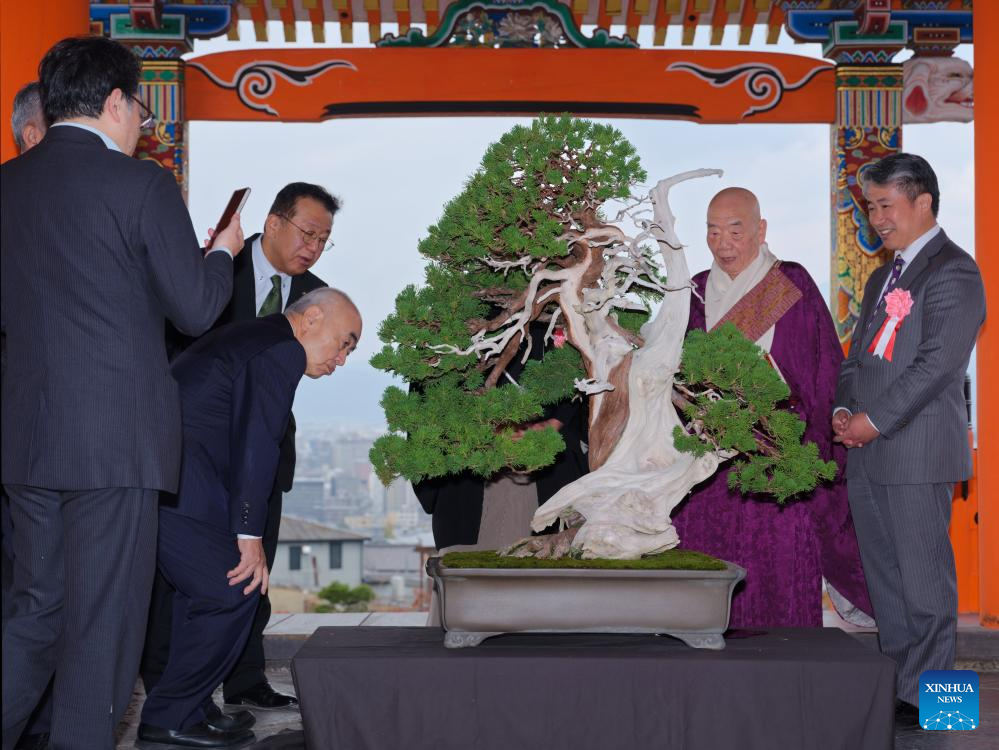 Chinese Consul General in Osaka Xue Jian (1st R), Mori Seihan (2nd R), abbot of Kiyomizu-dera Temple and other guests look at an 800-year-old bonsai during a bonsai and suiseki exhibition at Kiyomizu-dera Temple in Kyoto, Japan, Nov. 24, 2023. A four-day bonsai and suiseki exhibition commemorating the 45th anniversary of the signing of the China-Japan Treaty of Peace and Friendship kicked off here on Friday. (Xinhua/Zhang Xiaoyu)