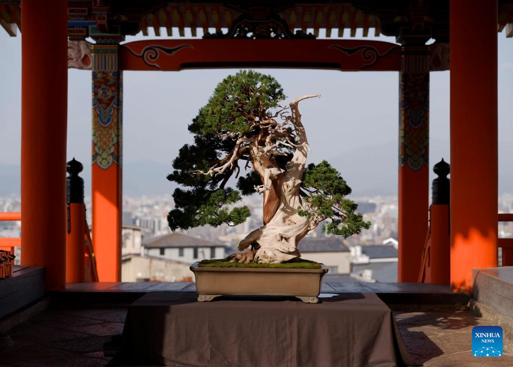 This photo shows an 800-year-old bonsai during a bonsai and suiseki exhibition at Kiyomizu-dera Temple in Kyoto, Japan, Nov. 24, 2023. A four-day bonsai and suiseki exhibition commemorating the 45th anniversary of the signing of the China-Japan Treaty of Peace and Friendship kicked off here on Friday. (Xinhua/Zhang Xiaoyu)