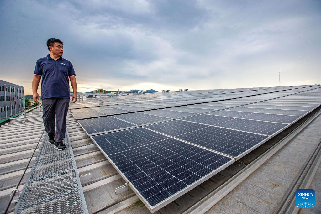 A staff member patrols on the solar rooftop at a tire factory in Chonburi province, Thailand, Nov. 7, 2023. Chinese company Prinx Chengshan Tire and WHA Utilities and Power (WHAUP) of Thailand have been jointly building a solar rooftop for the tire factory in Chonburi Province. The first-phase of the project started operation at the end of November 2022, with an installed capacity of 19.44 MW. The second-phase of the project is expected to be completed in 2024, by which the total installed capacity will reach 24.24 MW, capable of reducing 30,000 tonnes of carbon dioxide emission annually. (Xinhua/Wang Teng)